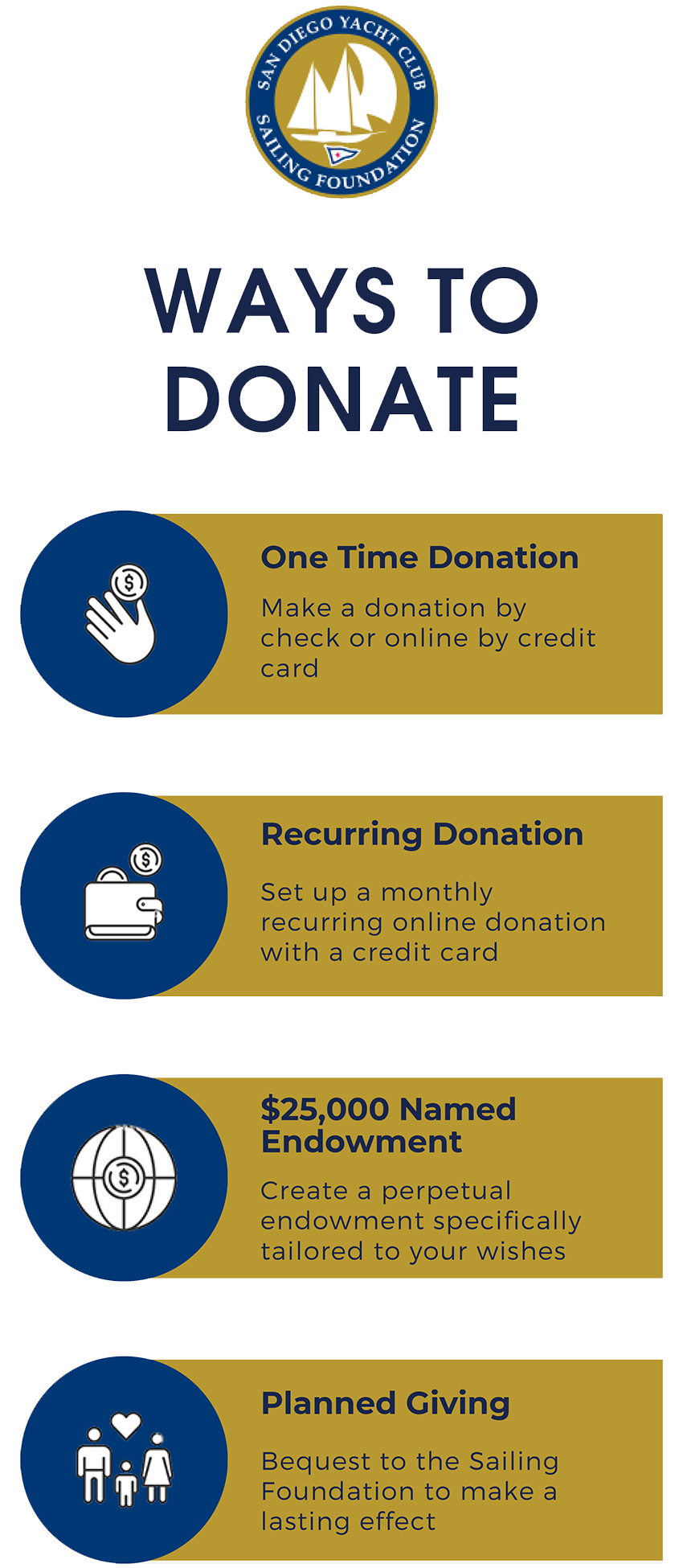 A gift of this type will make a lasting effect on the program for many years to come. If you want to talk with us about how to leave a bequest to the Sailing Foundation, we can help. Please contact us by email at sdycsf@gmail.com.